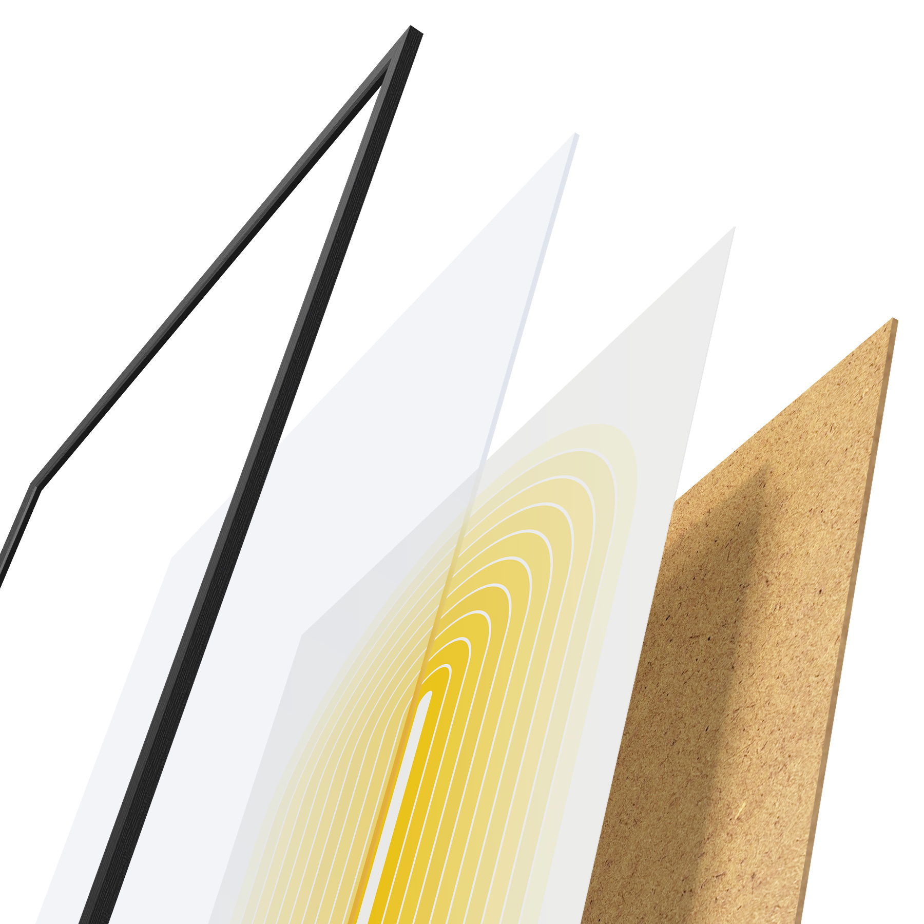 Le poster se compose d'un cadre, d'un plexiglas, d'une image imprimée et d'un support en aggloméré. Le poster peut être immédiatement accroché au mur grâce aux fixations au dos.