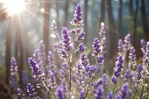 Affiche Fleurs de lavande violettes dans un champ, avec un arrière-plan de forêt flou et la lumière du soleil filtrant à travers f40570