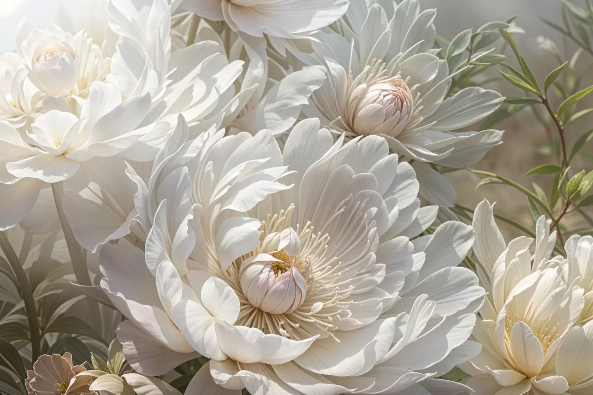 Affiche Gros plan de plusieurs grandes fleurs de pivoine blanches aux pétales doux et délicats et au centre jaune pâle f40575