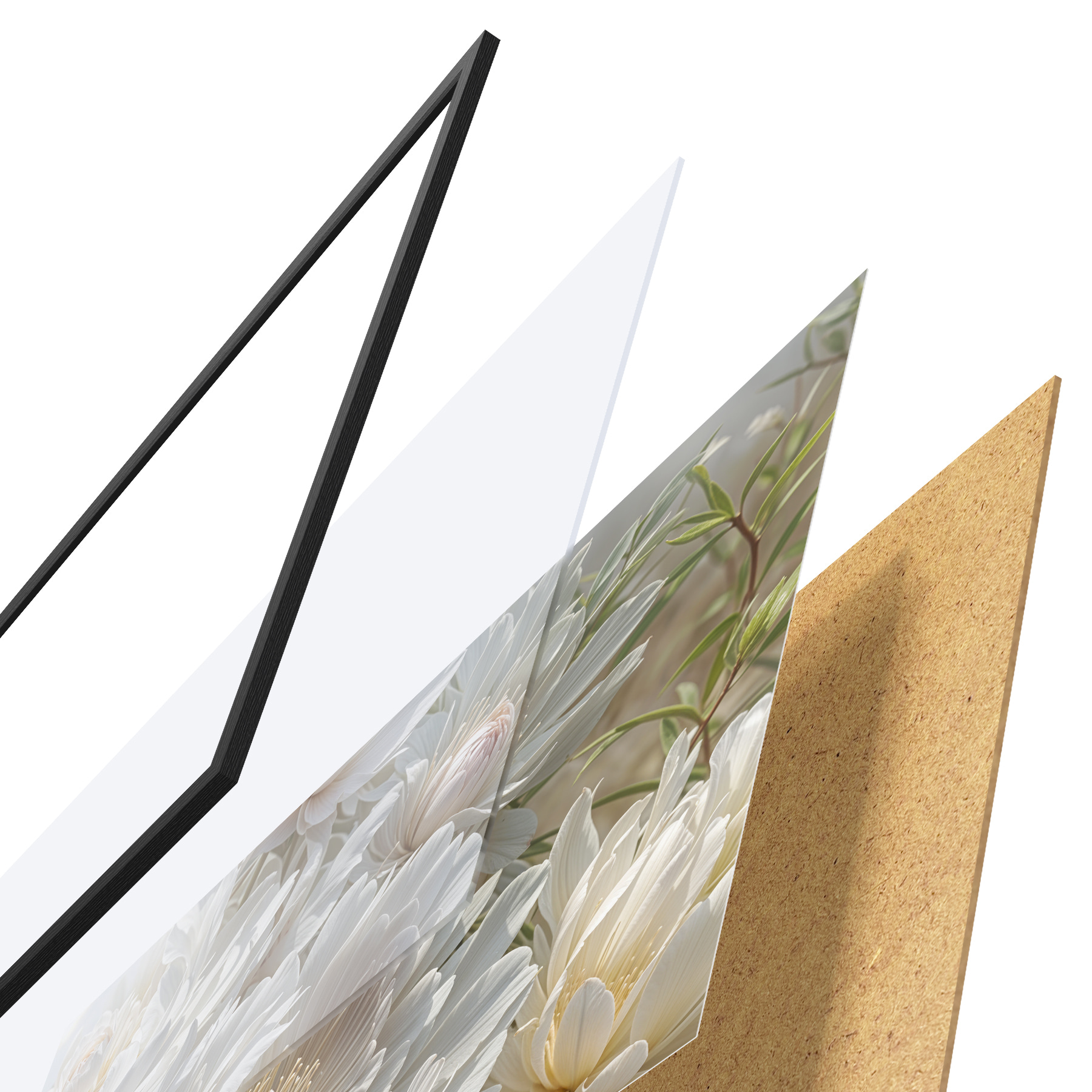 Le poster se compose d'un cadre, d'un plexiglas, d'une image imprimée et d'un support en aggloméré. Le poster peut être immédiatement accroché au mur grâce aux fixations au dos.