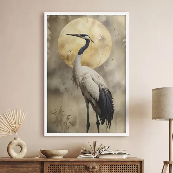 Affiche Une grue grise majestueuse se tenant devant une grande lune pleine, avec un arrière-plan naturel flou f40591