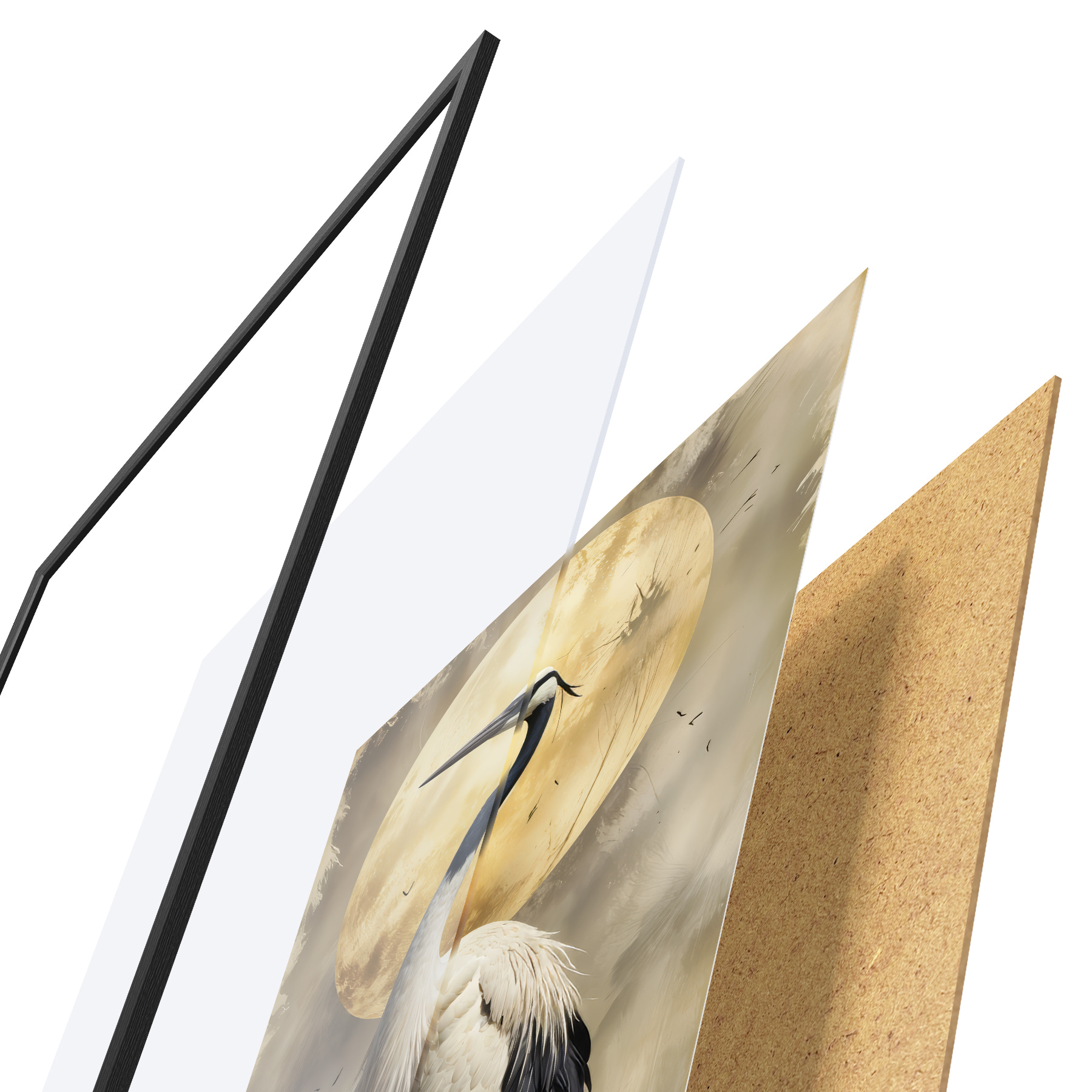 Affiche Une grue grise majestueuse se tenant devant une grande lune pleine, avec un arrière-plan naturel flou Non f40591