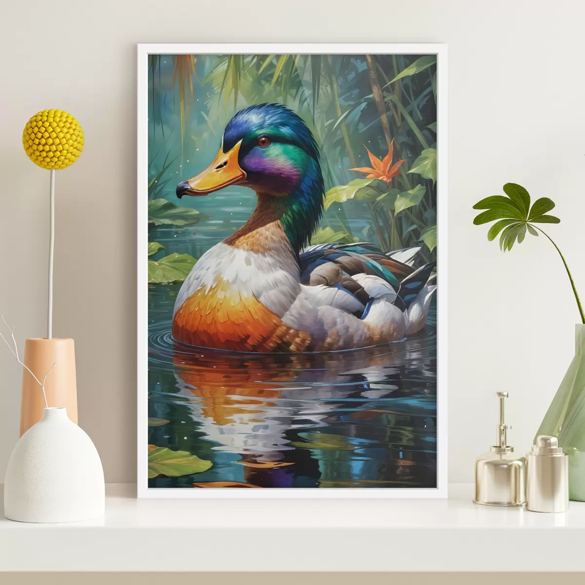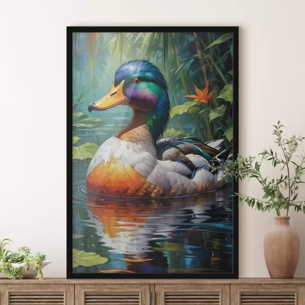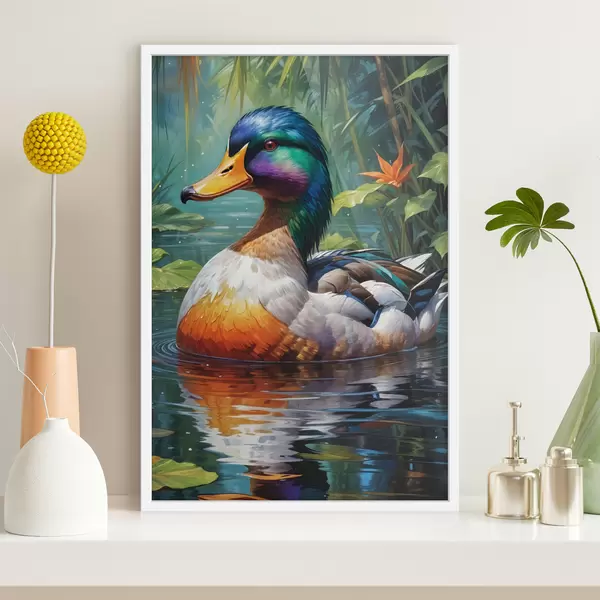 Affiche Un canard mandarin mâle coloré nageant dans un étang au feuillage vert luxuriant et aux feuilles d'automne tombées au sol f40594