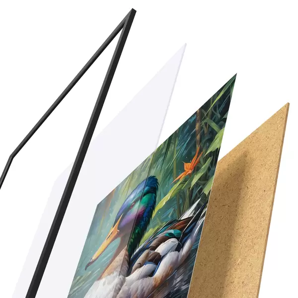 Le poster se compose d'un cadre, d'un plexiglas, d'une image imprimée et d'un support en aggloméré. Le poster peut être immédiatement accroché au mur grâce aux fixations au dos.