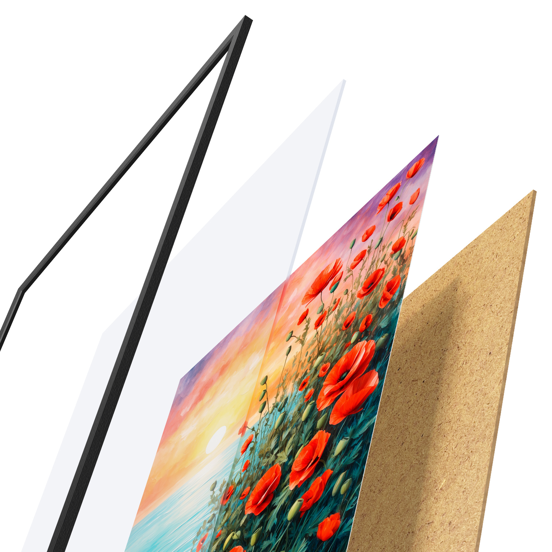 Le poster se compose d'un cadre, d'un plexiglas, d'une image imprimée et d'un support en aggloméré. Le poster peut être immédiatement accroché au mur grâce aux fixations au dos.