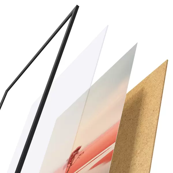 Le poster se compose d'un cadre, d'un plexiglas, d'une image imprimée et d'un support en aggloméré. Le poster peut être immédiatement accroché au mur grâce aux fixations au dos.