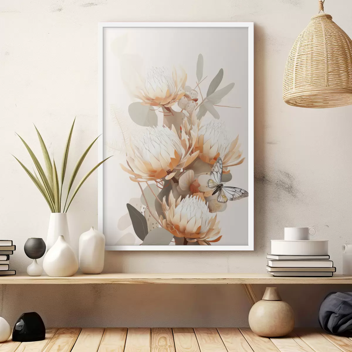 Affiche Magnifiques fleurs de protéa avec papillon, couleurs douces beige, coton f40816