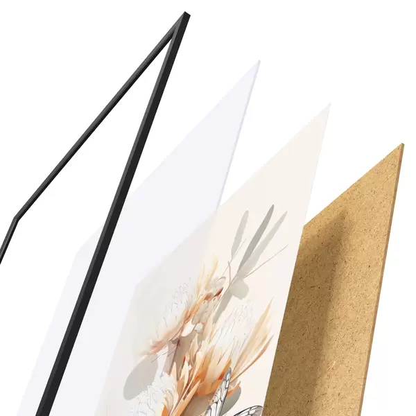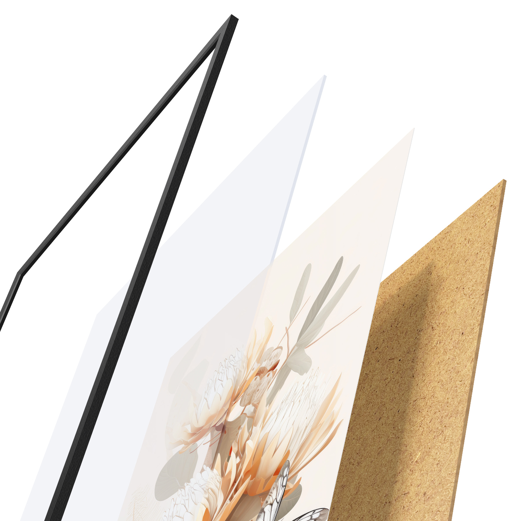 Le poster se compose d'un cadre, d'un plexiglas, d'une image imprimée et d'un support en aggloméré. Le poster peut être immédiatement accroché au mur grâce aux fixations au dos.