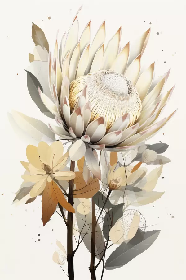 Affiche Magnifiques fleurs de protéa avec des feuilles luxuriantes, couleurs douces et beiges, coton f40817