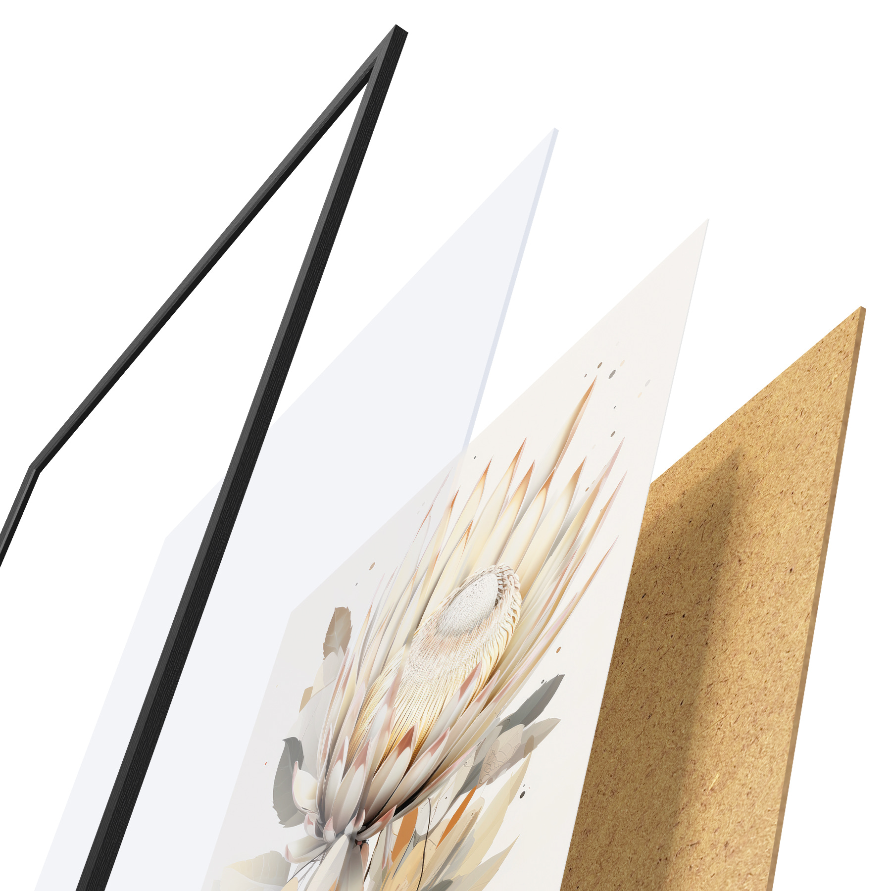 Le poster se compose d'un cadre, d'un plexiglas, d'une image imprimée et d'un support en aggloméré. Le poster peut être immédiatement accroché au mur grâce aux fixations au dos.