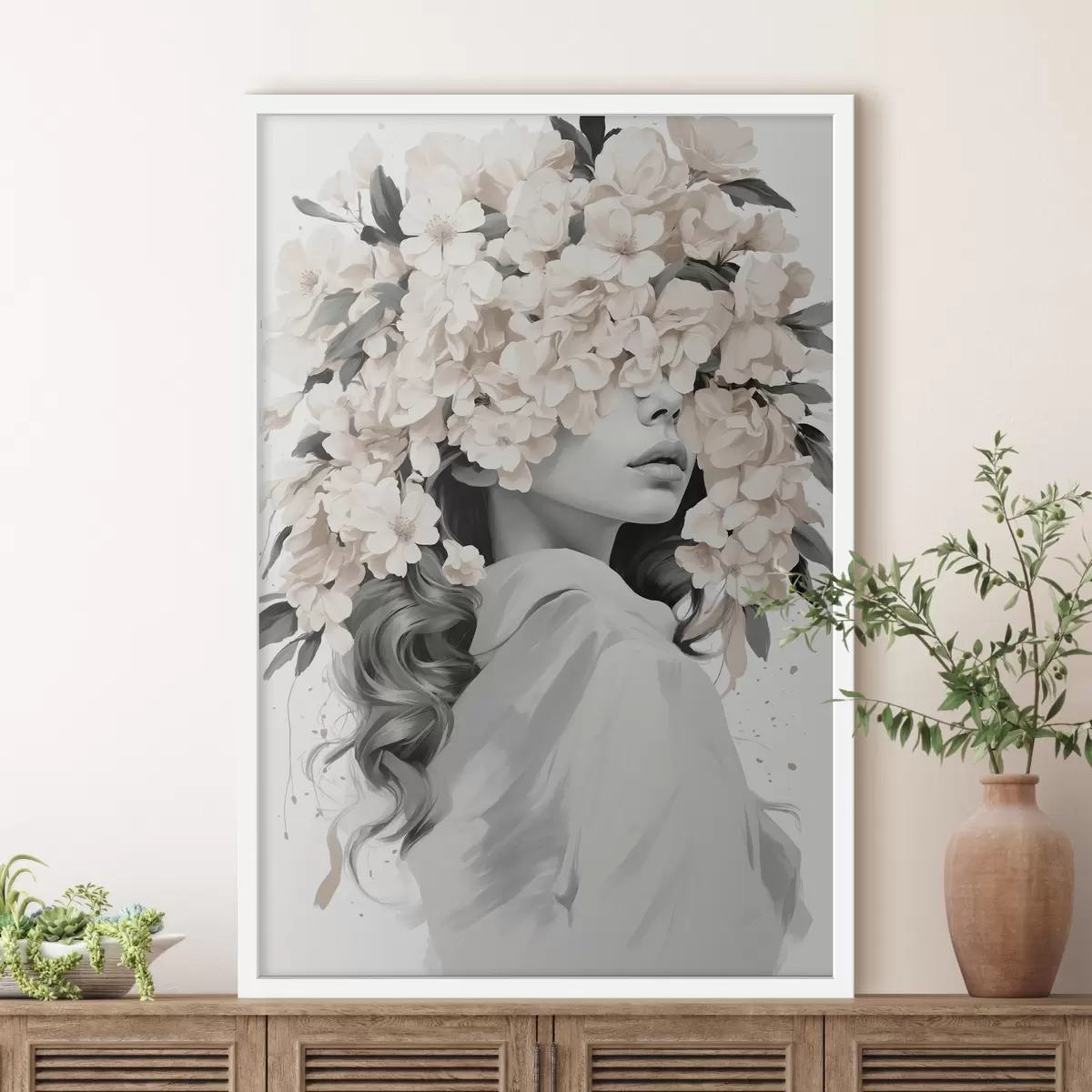 Affiche Fille avec des fleurs sur le visage en noir et blanc Non f40849