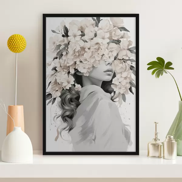 Affiche Fille avec des fleurs sur le visage en noir et blanc f40849