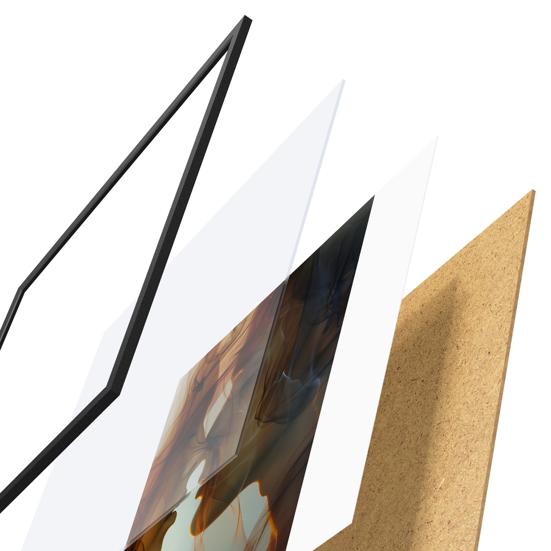 Le poster se compose d'un cadre, d'un plexiglas, d'une image imprimée et d'un support en aggloméré. Le poster peut être immédiatement accroché au mur grâce aux fixations au dos.