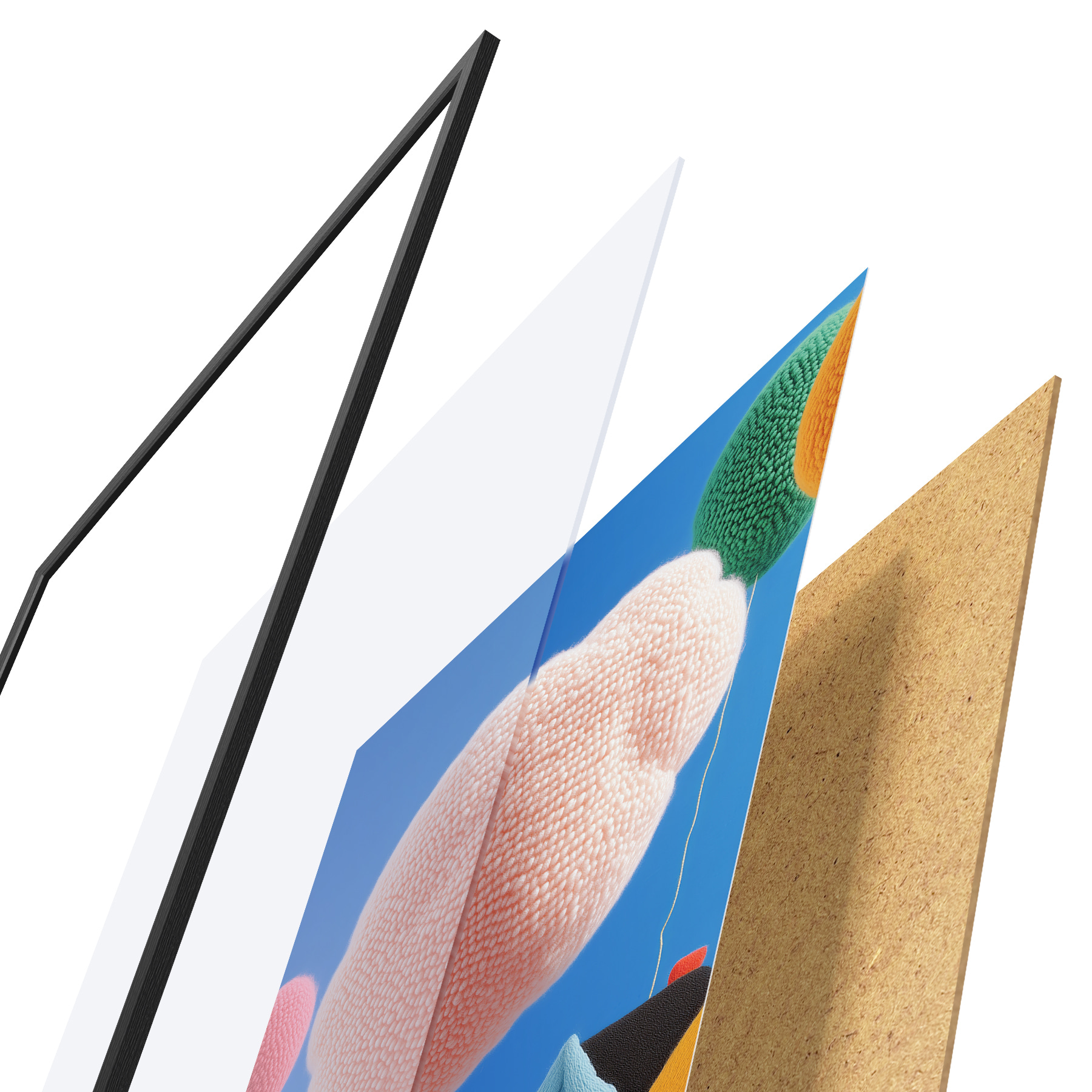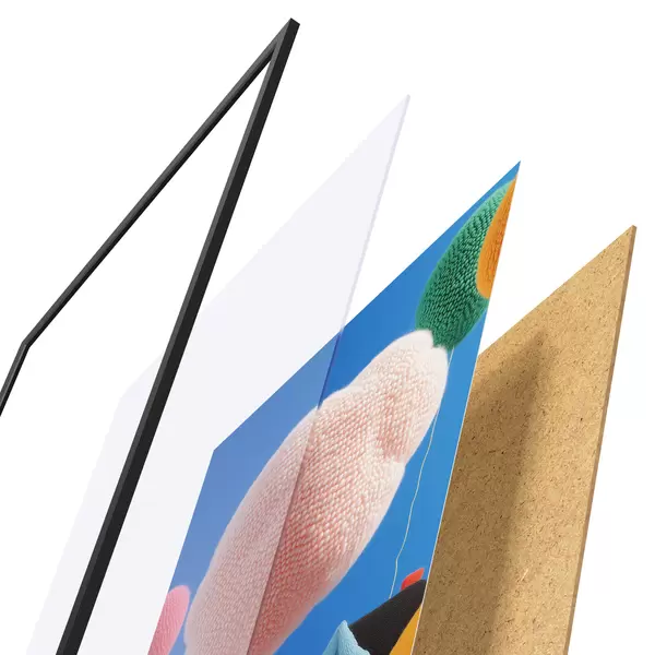 Le poster se compose d'un cadre, d'un plexiglas, d'une image imprimée et d'un support en aggloméré. Le poster peut être immédiatement accroché au mur grâce aux fixations au dos.