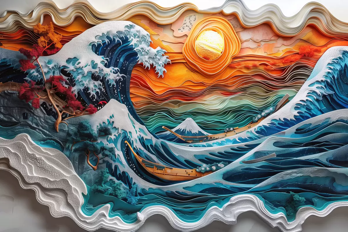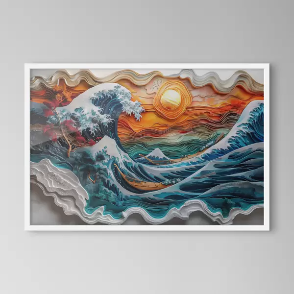 Affiche Imitation de bas-relief : un océan déchaîné avec des bateaux et le soleil Non f40976