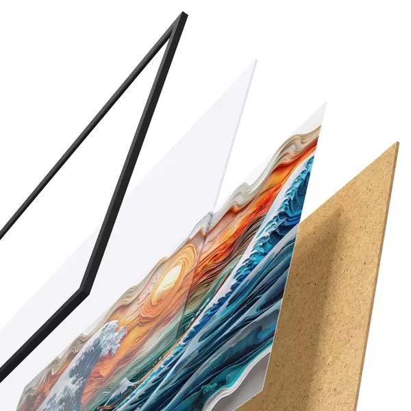 Le poster se compose d'un cadre, d'un plexiglas, d'une image imprimée et d'un support en aggloméré. Le poster peut être immédiatement accroché au mur grâce aux fixations au dos.