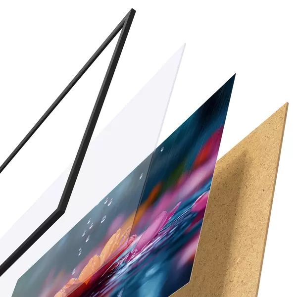 Le poster se compose d'un cadre, d'un plexiglas, d'une image imprimée et d'un support en aggloméré. Le poster peut être immédiatement accroché au mur grâce aux fixations au dos.