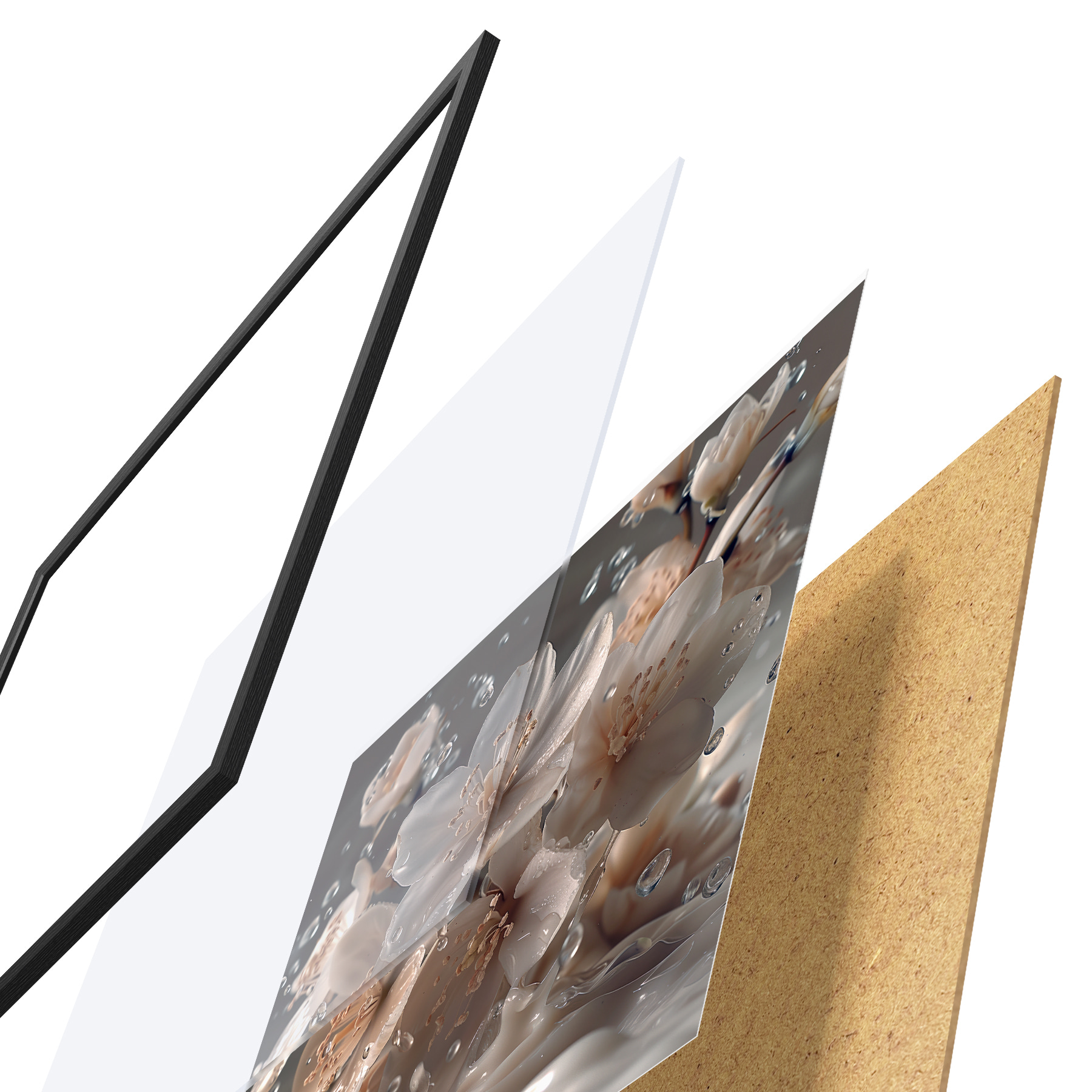 Le poster se compose d'un cadre, d'un plexiglas, d'une image imprimée et d'un support en aggloméré. Le poster peut être immédiatement accroché au mur grâce aux fixations au dos.