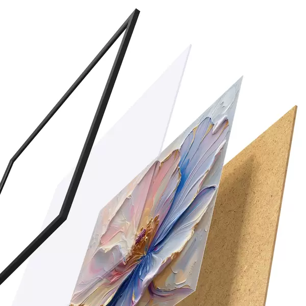 Le poster se compose d'un cadre, d'un plexiglas, d'une image imprimée et d'un support en aggloméré. Le poster peut être immédiatement accroché au mur grâce aux fixations au dos.