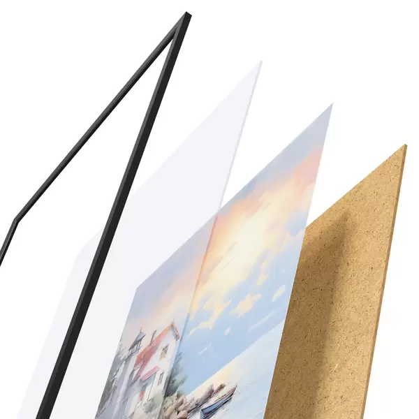 Le poster se compose d'un cadre, d'un plexiglas, d'une image imprimée et d'un support en aggloméré. Le poster peut être immédiatement accroché au mur grâce aux fixations au dos.