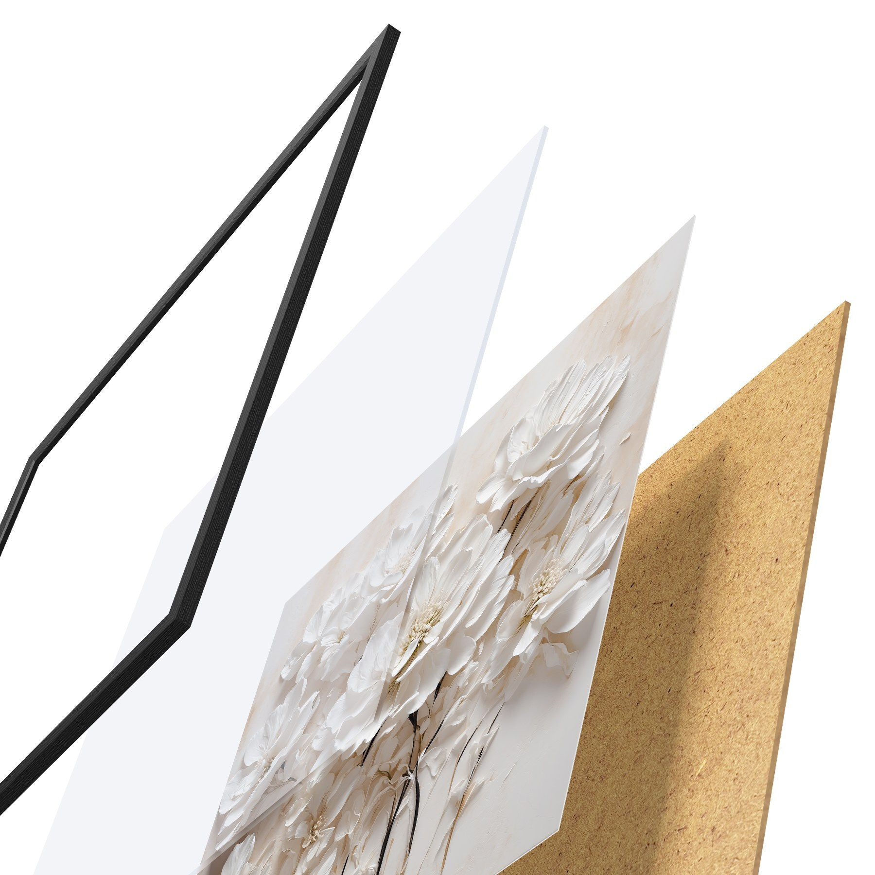 Le poster se compose d'un cadre, d'un plexiglas, d'une image imprimée et d'un support en aggloméré. Le poster peut être immédiatement accroché au mur grâce aux fixations au dos.