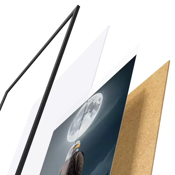 Le poster se compose d'un cadre, d'un plexiglas, d'une image imprimée et d'un support en aggloméré. Le poster peut être immédiatement accroché au mur grâce aux fixations au dos.