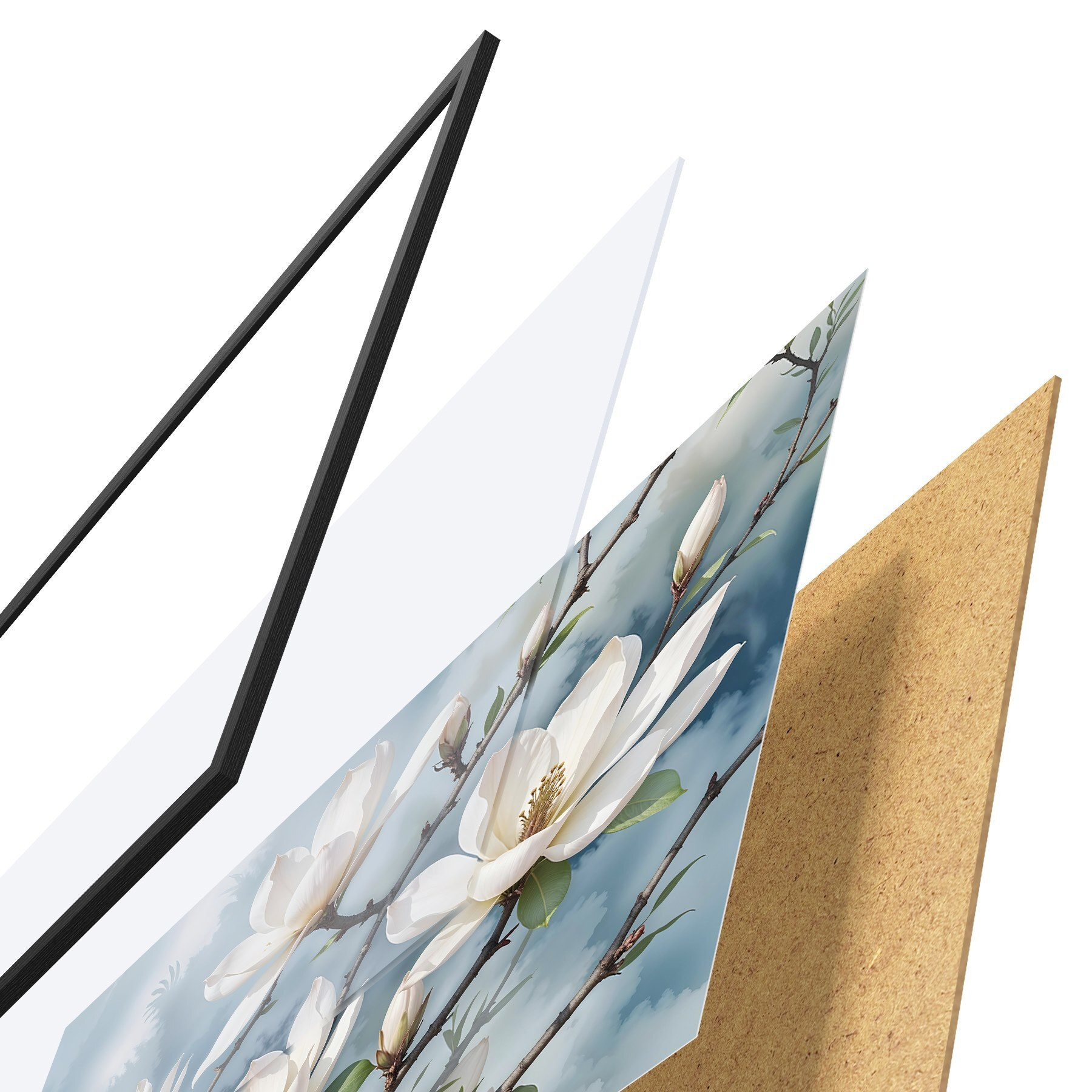 Affiche Fleurs de magnolia blanches s'épanouissant sur des branches d'arbre sur un fond de ciel bleu aquarelle doux Non f41081