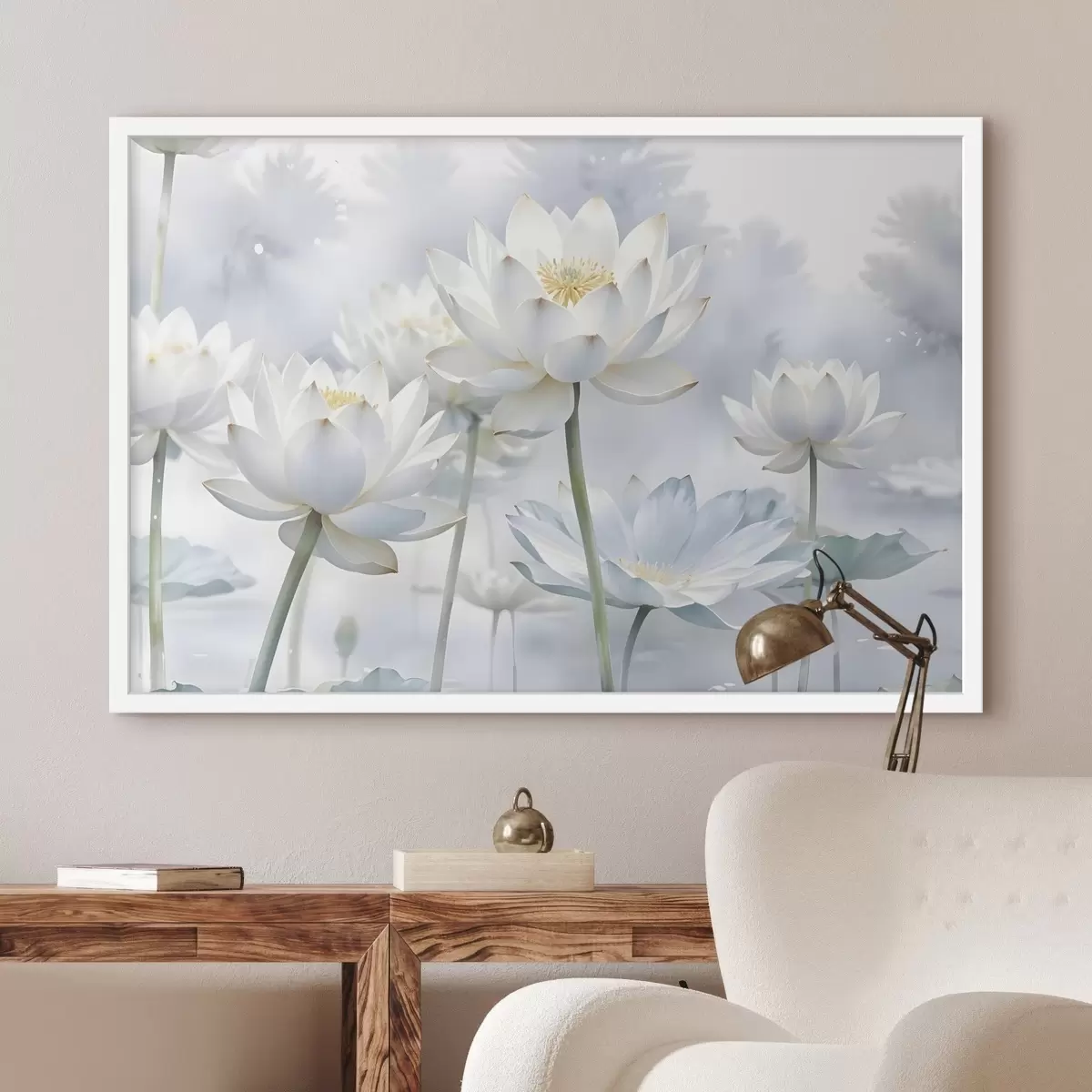 Affiche Fleurs de lotus blanches aux couleurs pastel sur un fond aquarellé abstrait et brumeux Non f41100