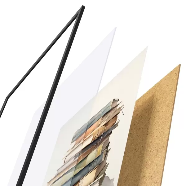 Le poster se compose d'un cadre, d'un plexiglas, d'une image imprimée et d'un support en aggloméré. Le poster peut être immédiatement accroché au mur grâce aux fixations au dos.
