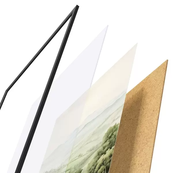 Le poster se compose d'un cadre, d'un plexiglas, d'une image imprimée et d'un support en aggloméré. Le poster peut être immédiatement accroché au mur grâce aux fixations au dos.
