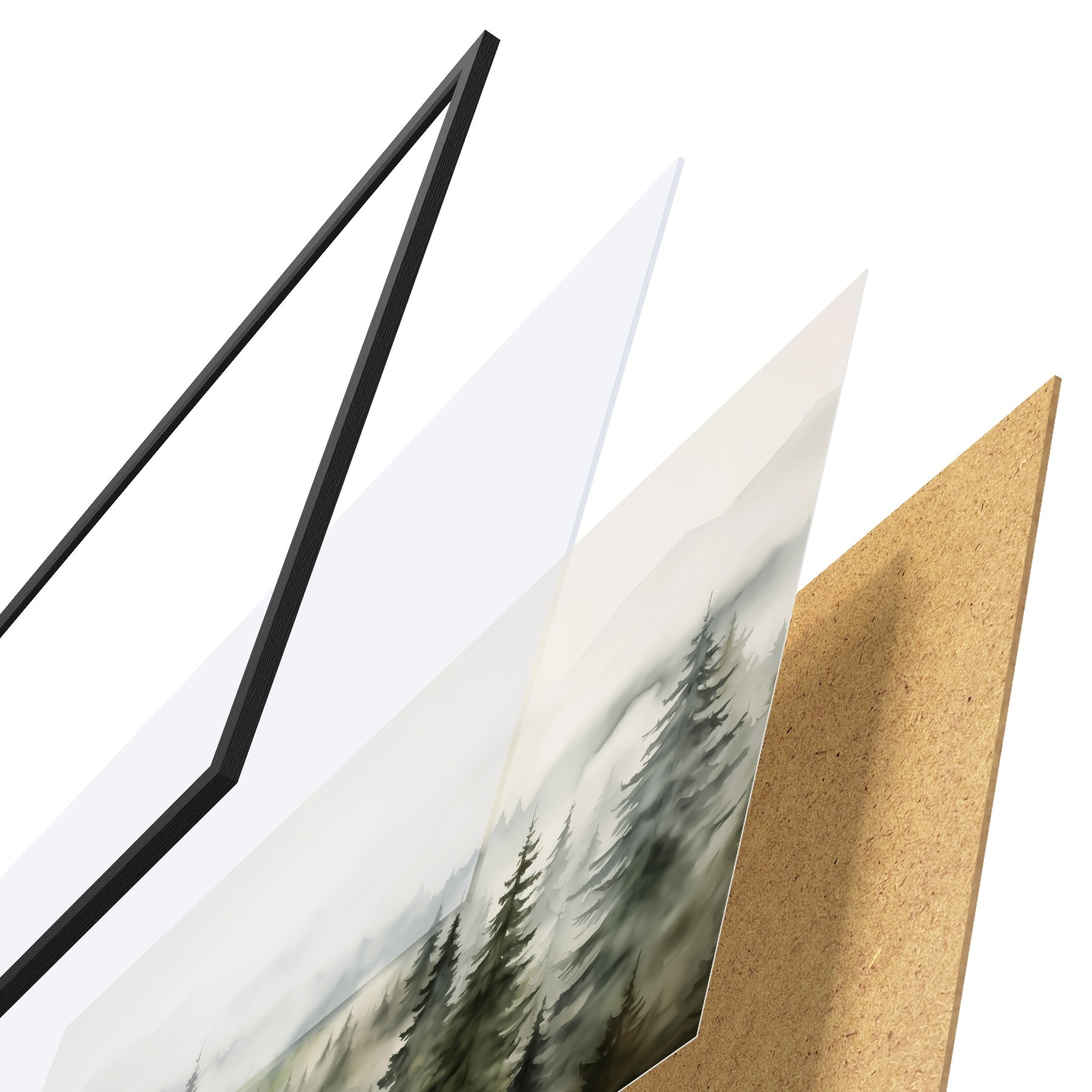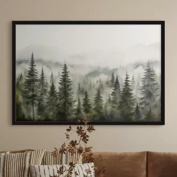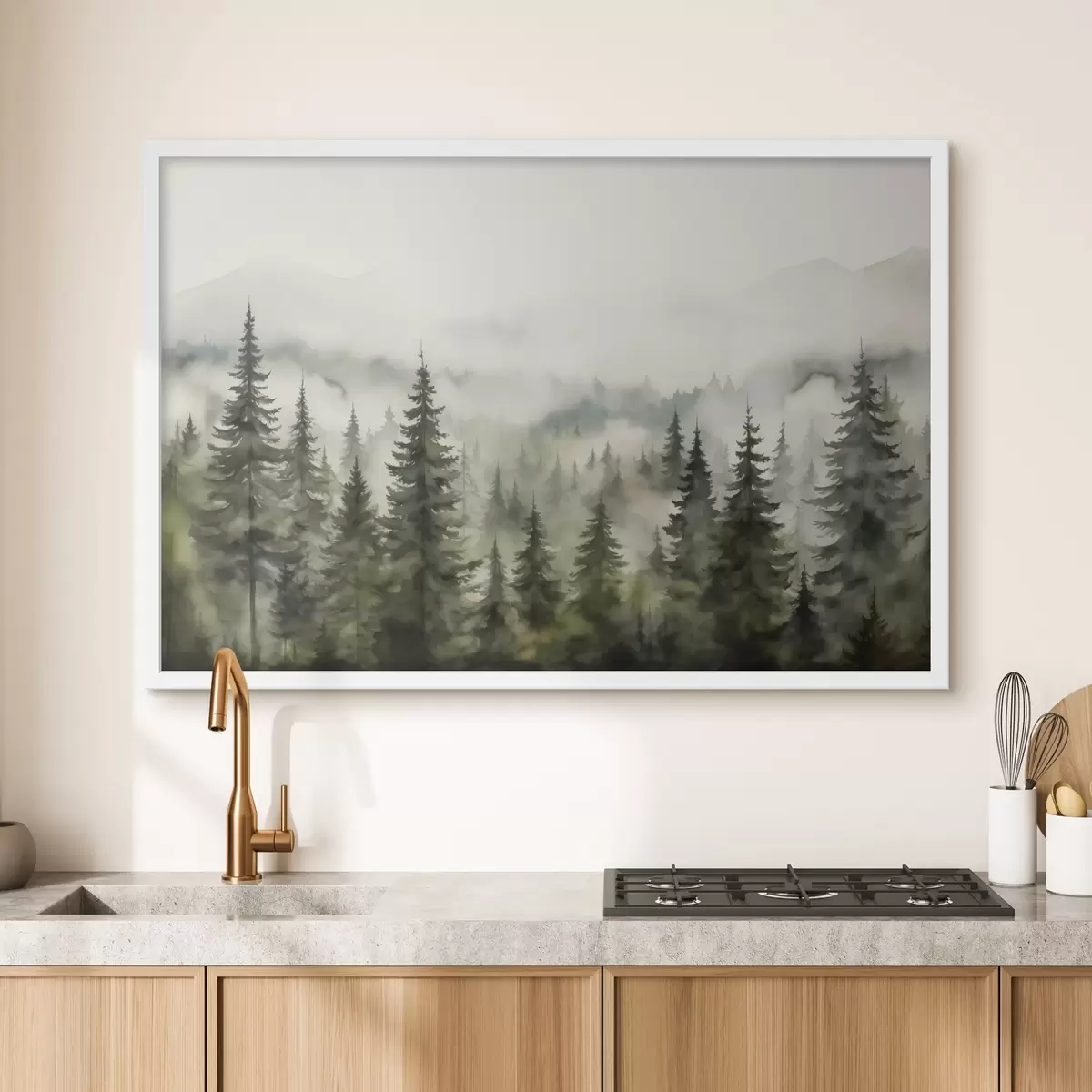 Affiche Forêt verte sur fond de montagnes et de brouillard aquarelle Non f41241