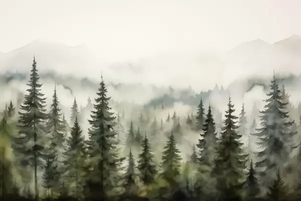 Affiche Forêt verte sur fond de montagnes et de brouillard aquarelle Non f41241