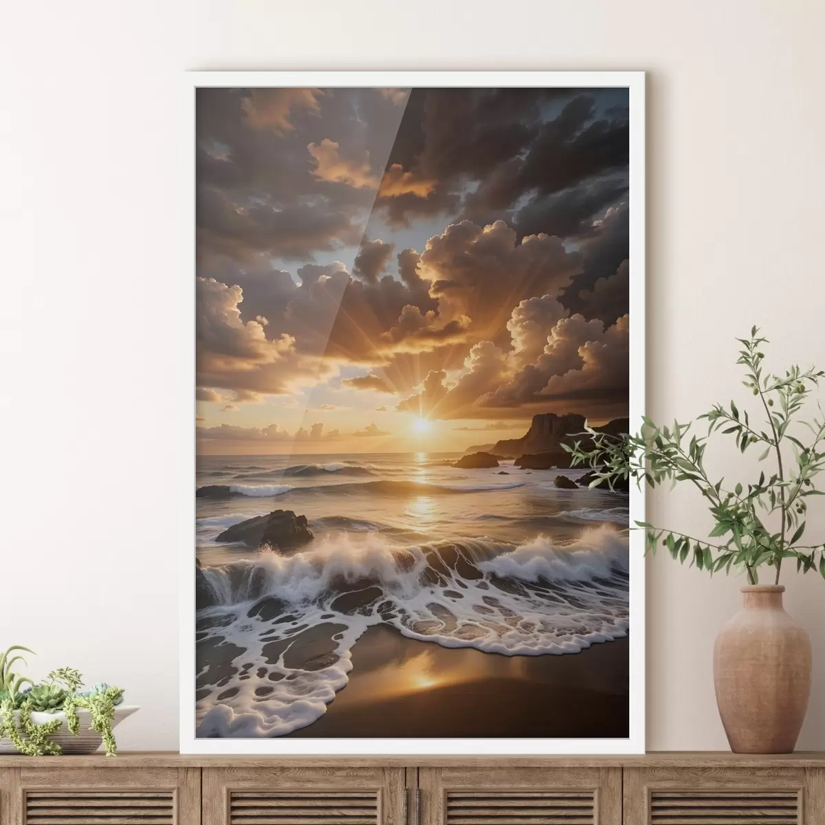 Affiche Coucher de soleil spectaculaire sur une côte rocheuse, avec des vagues déferlantes et des nuages spectaculaires dans le ciel Non f41245
