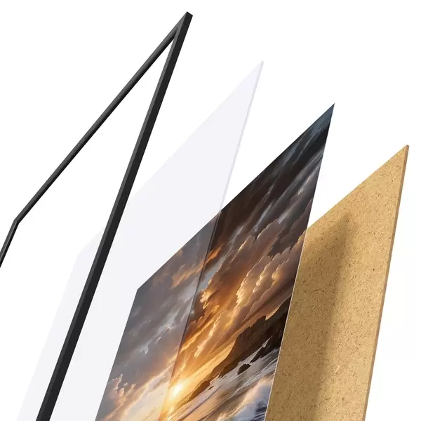 Le poster se compose d'un cadre, d'un plexiglas, d'une image imprimée et d'un support en aggloméré. Le poster peut être immédiatement accroché au mur grâce aux fixations au dos.