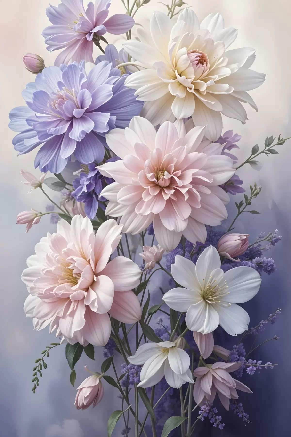 Affiche Un bouquet de grandes fleurs de dahlia vibrantes dans des tons de rose, de lavande et de blanc sur un arrière-plan doux et flou f41247