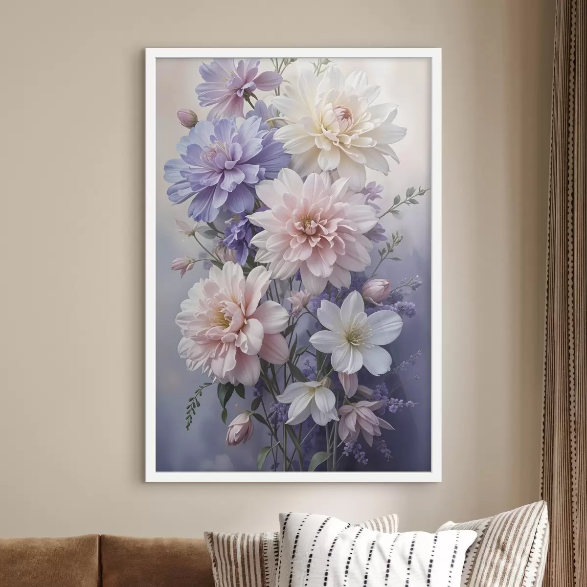Affiche Un bouquet de grandes fleurs de dahlia vibrantes dans des tons de rose, de lavande et de blanc sur un arrière-plan doux et flou Non f41247
