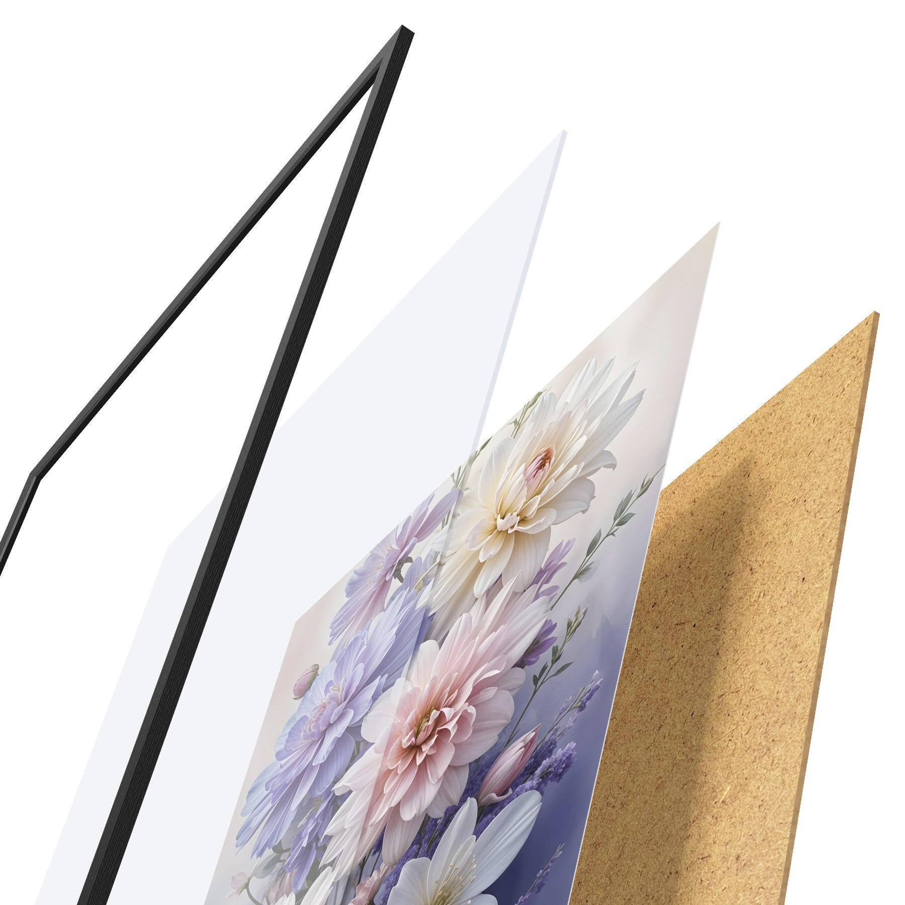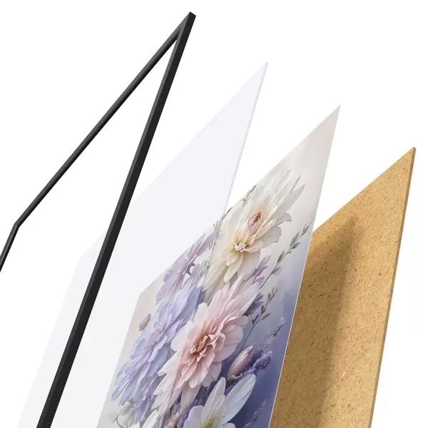 Le poster se compose d'un cadre, d'un plexiglas, d'une image imprimée et d'un support en aggloméré. Le poster peut être immédiatement accroché au mur grâce aux fixations au dos.