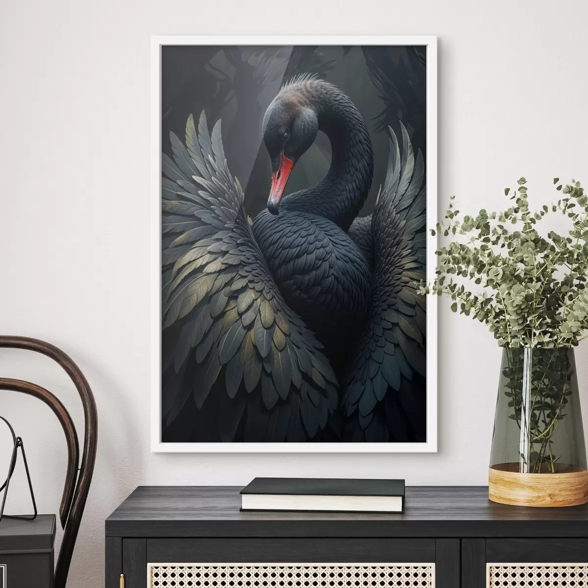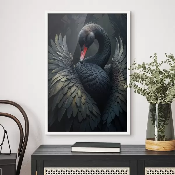 Affiche Un cygne noir aux ailes déployées, mettant en valeur ses plumes noires et son bec rouge sur un fond sombre f41249