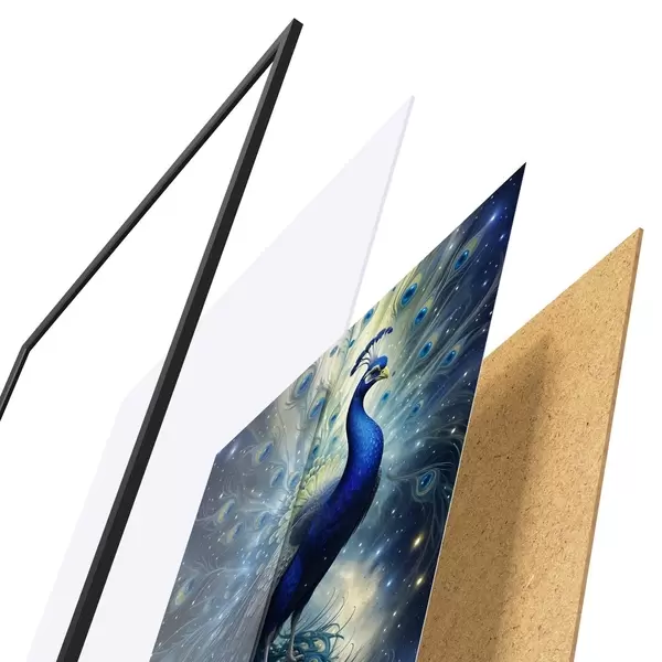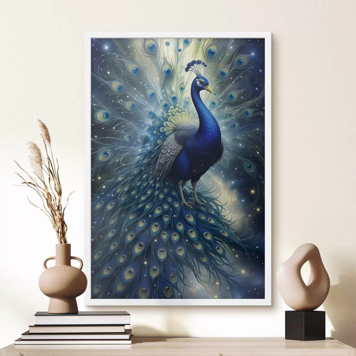 Affiche Un paon vibrant et majestueux sur fond de ciel étoilé, créant une atmosphère magique et éthérée f41256