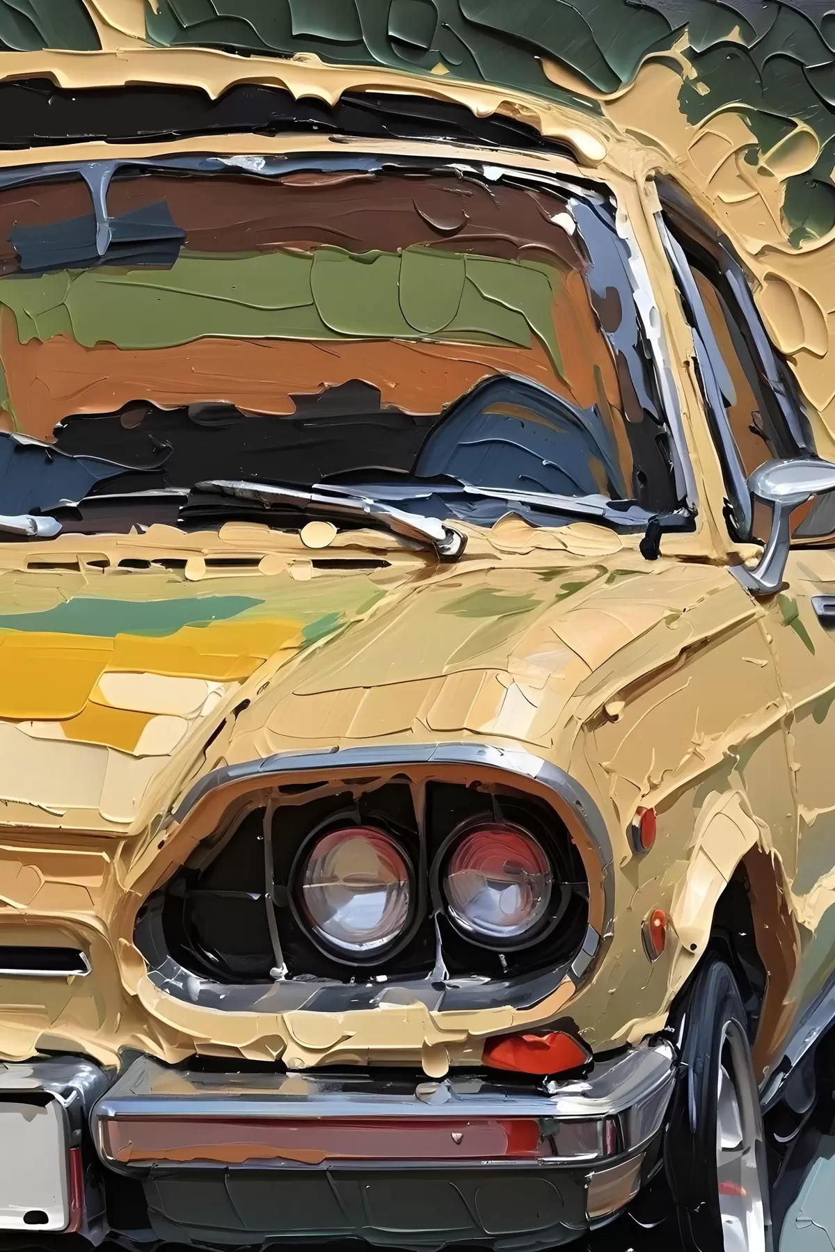 Affiche Imitation d'un empâtement de peinture à l'huile représentant une voiture jaune sur un fond coloré et abstrait Non f41261