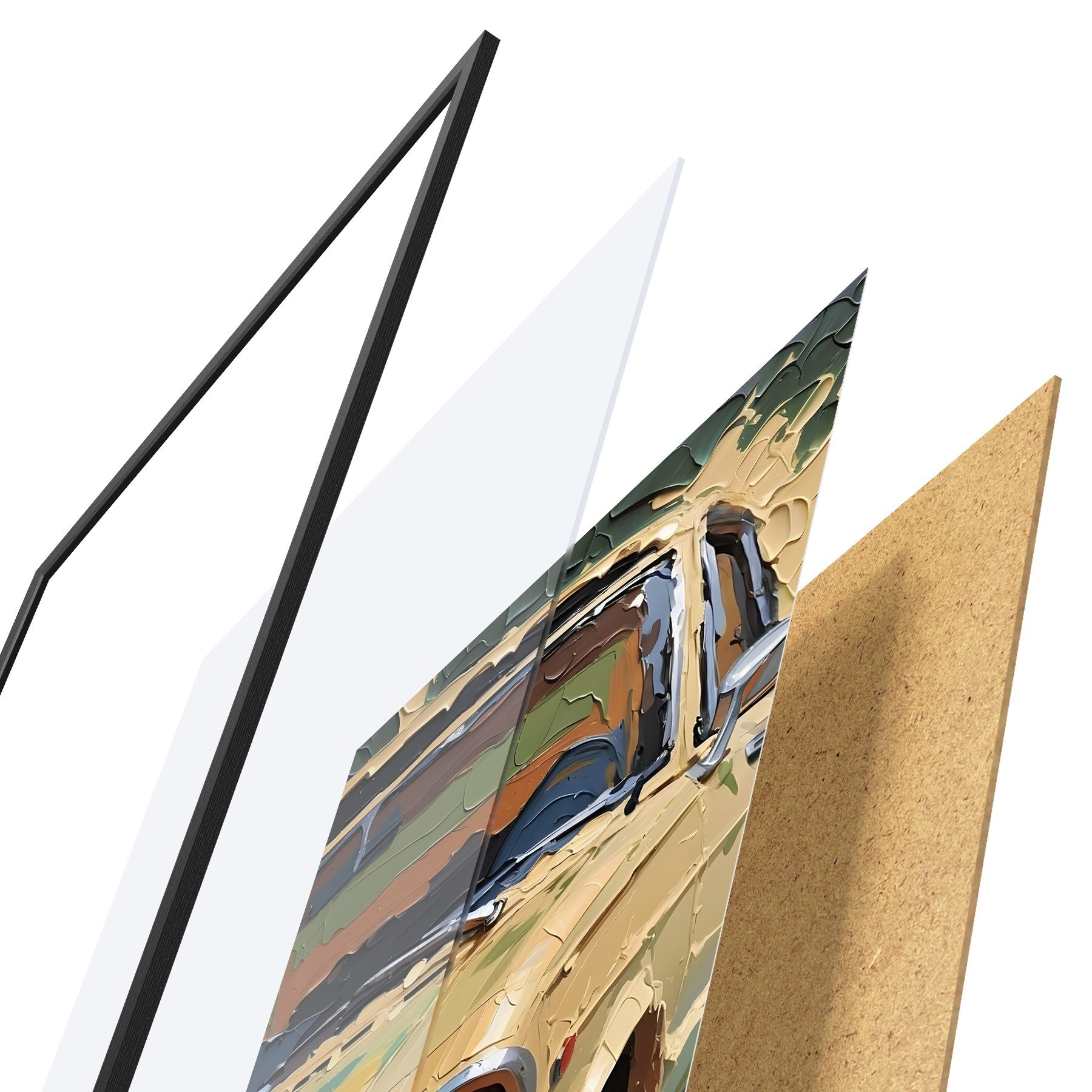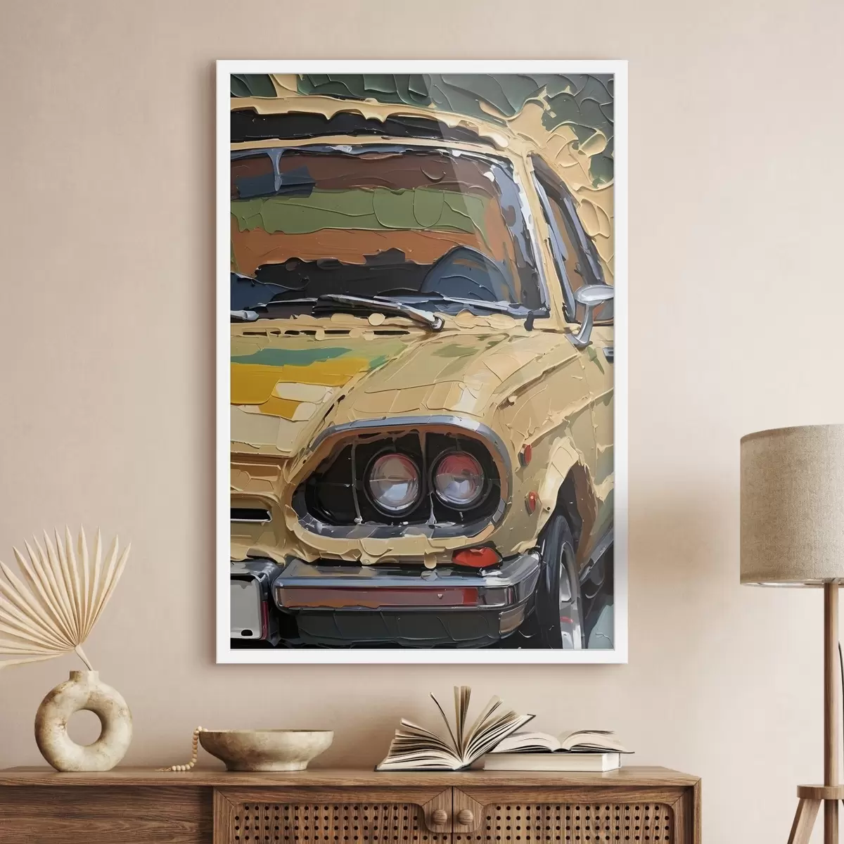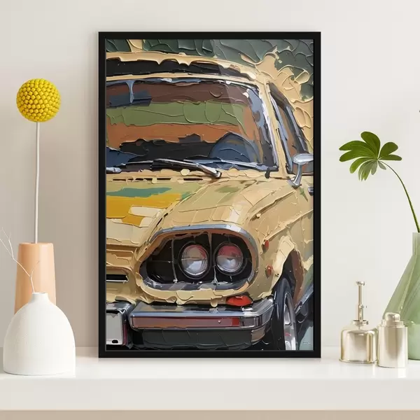 Affiche Imitation d'un empâtement de peinture à l'huile représentant une voiture jaune sur un fond coloré et abstrait f41261