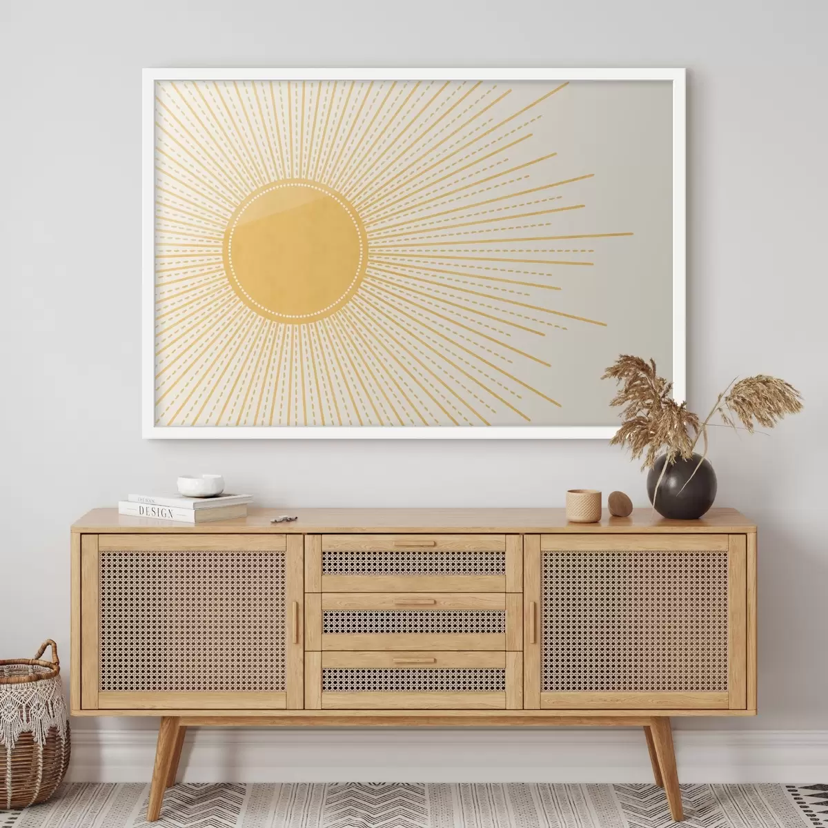 Affiche Un soleil jaune vif avec des rayons de soleil rayonnants sur un fond clair, créant une atmosphère chaude et ensoleillée f41268
