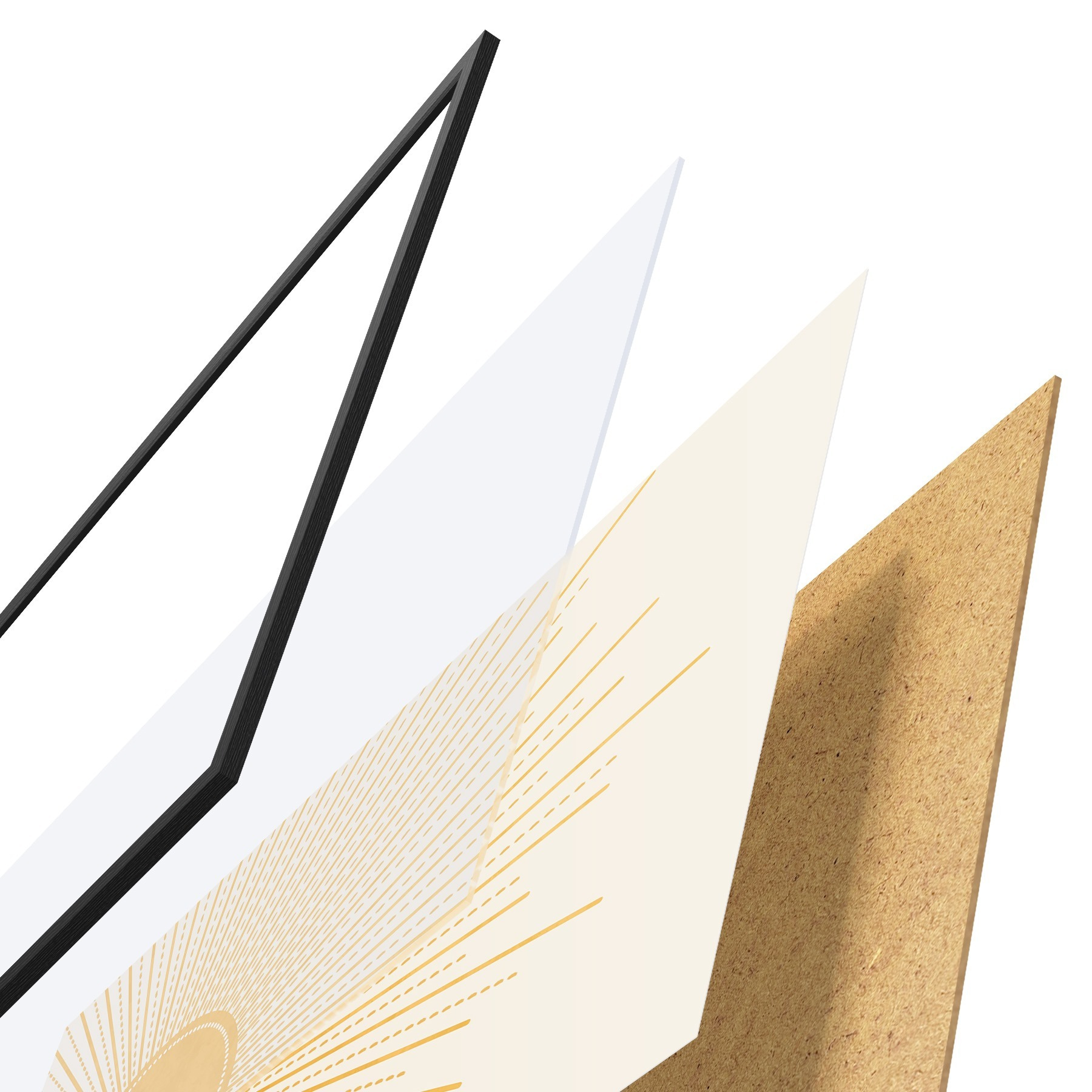 Le poster se compose d'un cadre, d'un plexiglas, d'une image imprimée et d'un support en aggloméré. Le poster peut être immédiatement accroché au mur grâce aux fixations au dos.