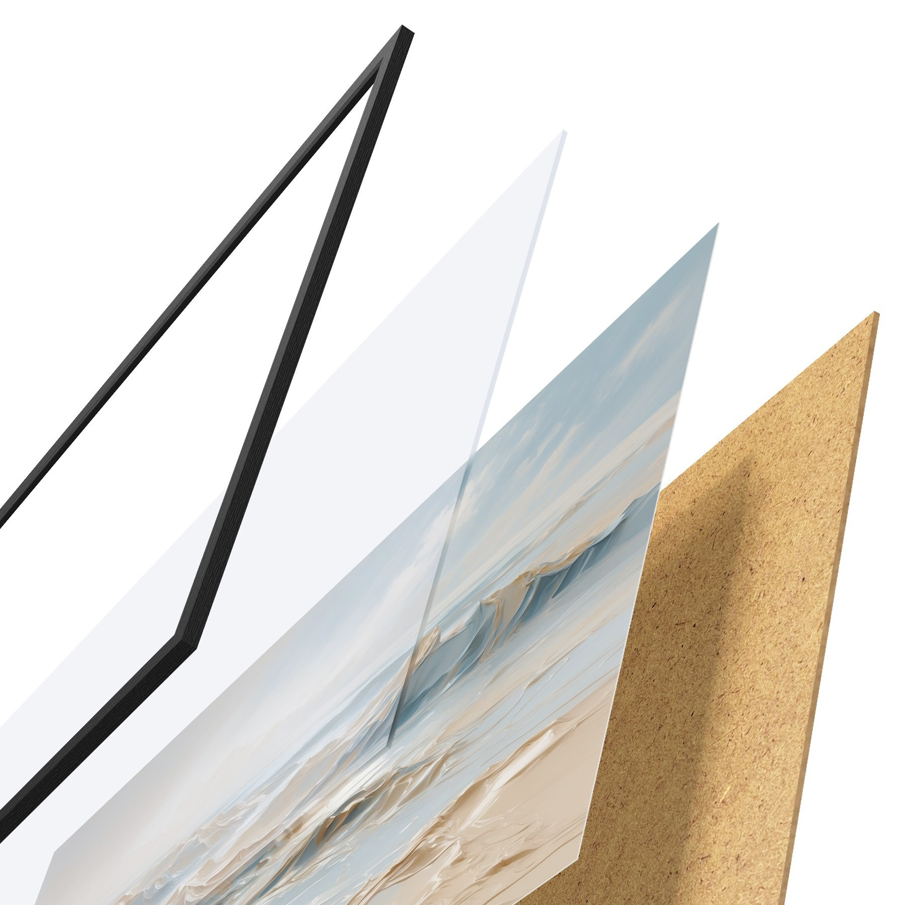Le poster se compose d'un cadre, d'un plexiglas, d'une image imprimée et d'un support en aggloméré. Le poster peut être immédiatement accroché au mur grâce aux fixations au dos.