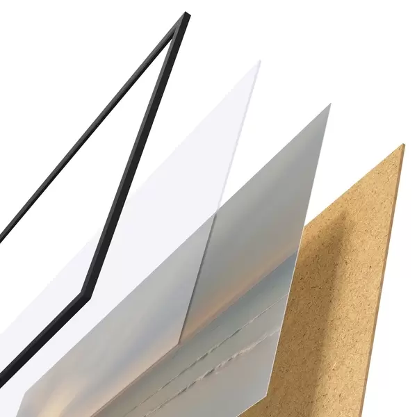 Le poster se compose d'un cadre, d'un plexiglas, d'une image imprimée et d'un support en aggloméré. Le poster peut être immédiatement accroché au mur grâce aux fixations au dos.
