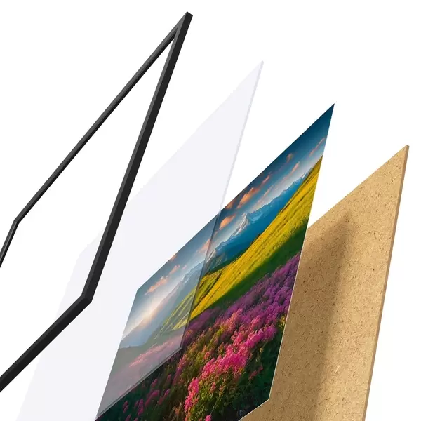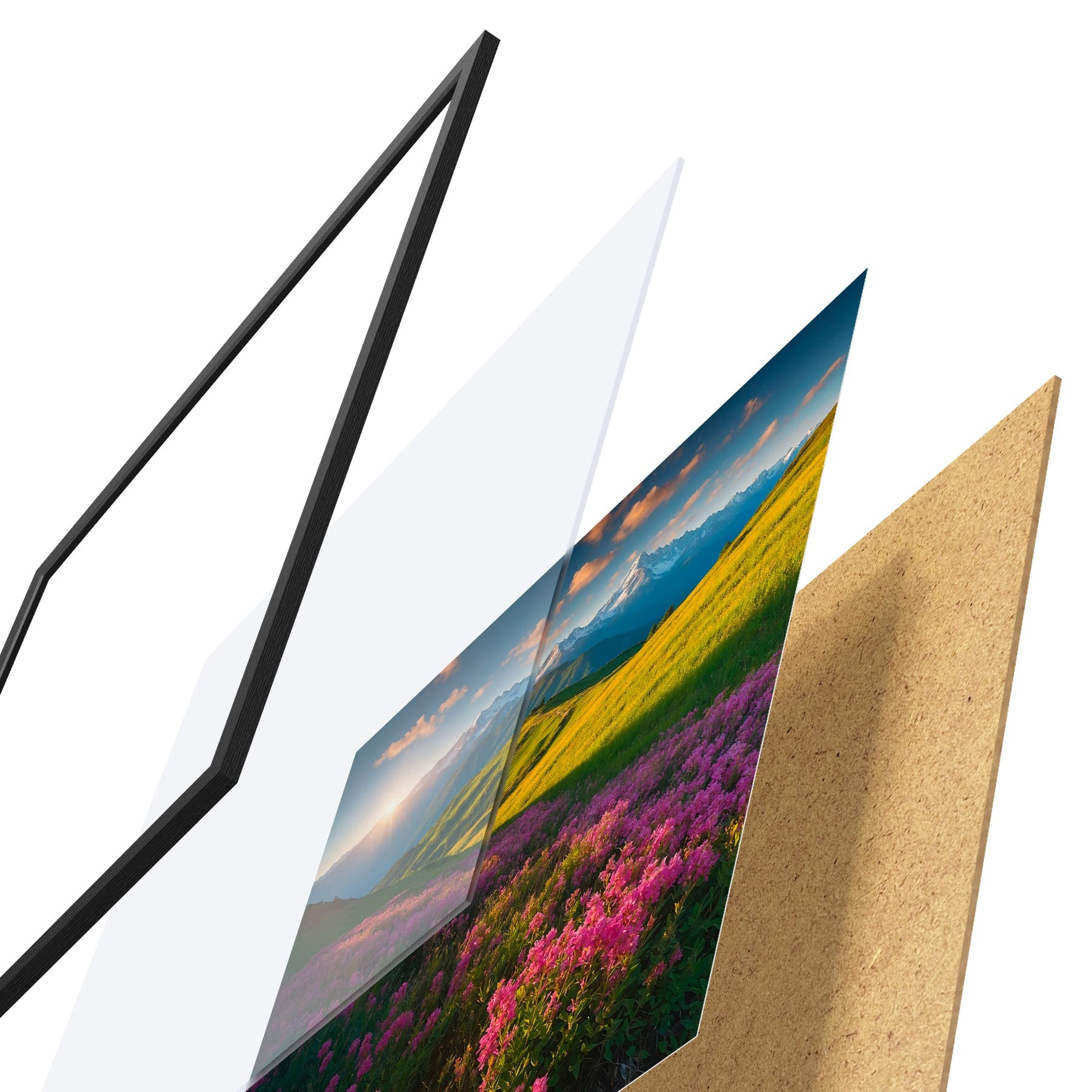 Le poster se compose d'un cadre, d'un plexiglas, d'une image imprimée et d'un support en aggloméré. Le poster peut être immédiatement accroché au mur grâce aux fixations au dos.