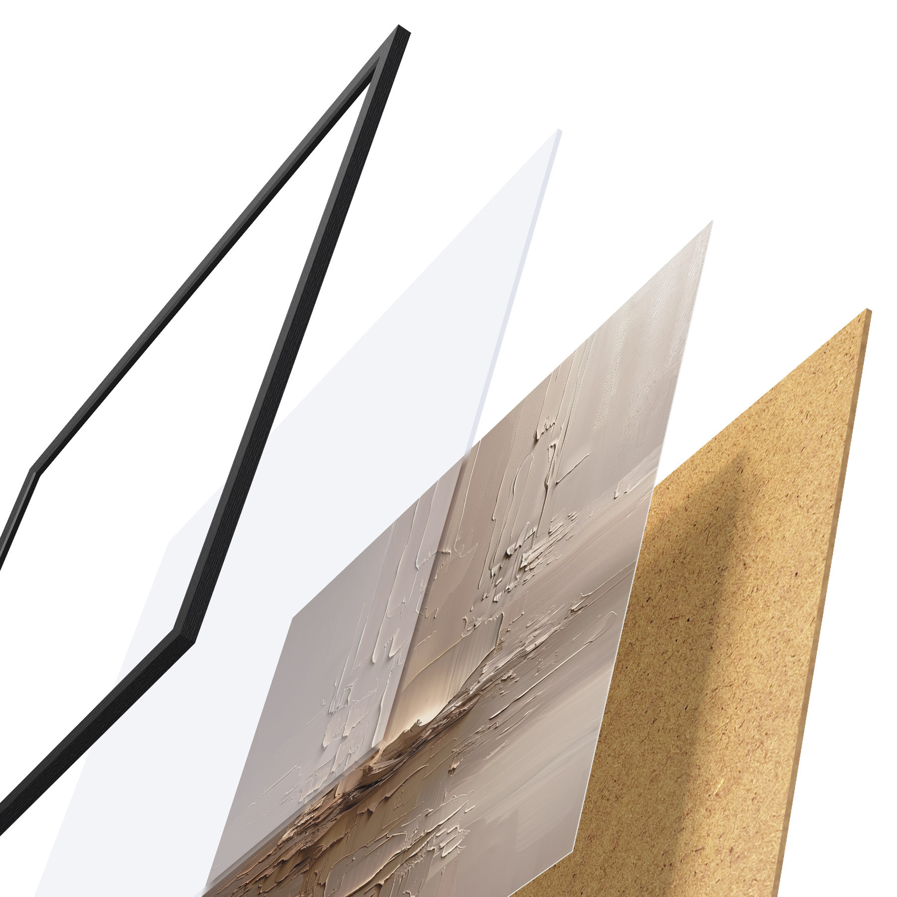Le poster se compose d'un cadre, d'un plexiglas, d'une image imprimée et d'un support en aggloméré. Le poster peut être immédiatement accroché au mur grâce aux fixations au dos.