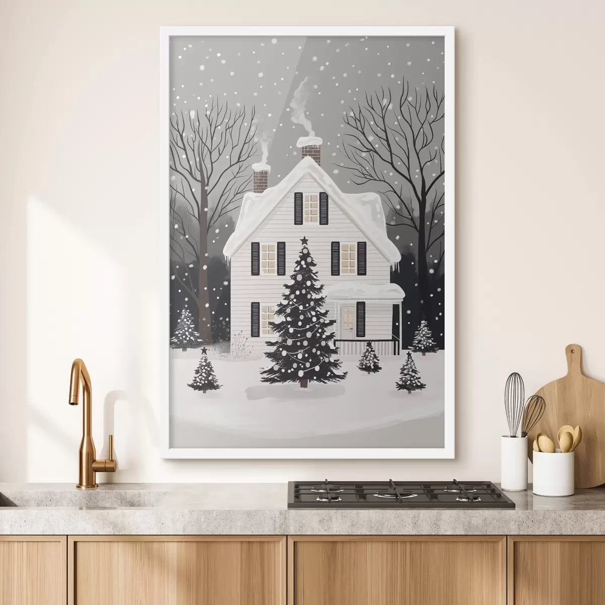 Affiche Ville d'hiver, sapin décoré, Noël, forêt, belle maison Non f41371