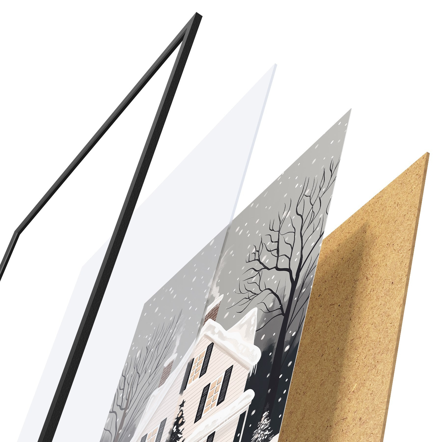 Le poster se compose d'un cadre, d'un plexiglas, d'une image imprimée et d'un support en aggloméré. Le poster peut être immédiatement accroché au mur grâce aux fixations au dos.