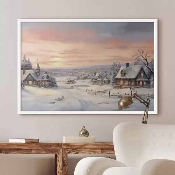 Affiche Coucher de soleil dans le village d'hiver, rustique, aquarelle, flocons de neige f41386